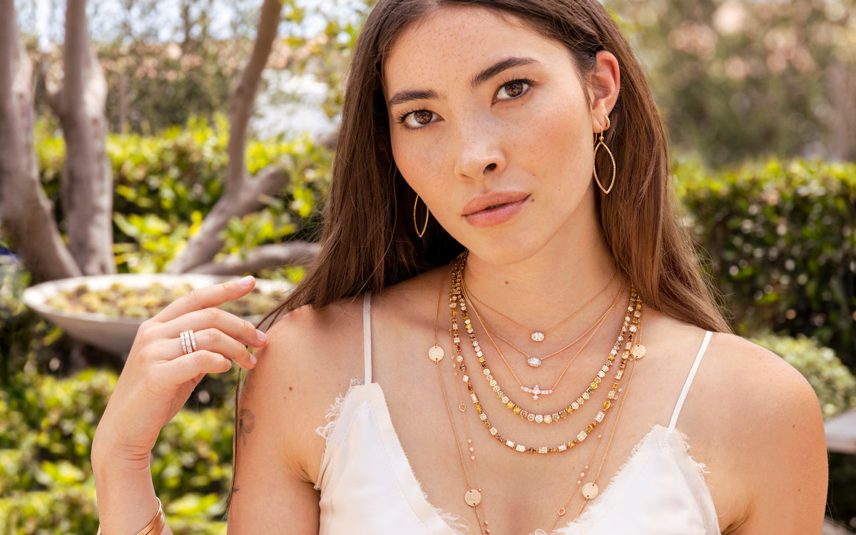 Graceful diamond-kissed delicate station necklace with iconic Dominique Cohen bamboo-texture feature links. A must-have style for every gal's jewelry wardrobe! Delightfully delicate solo — say, wrapped as one short loop, choker style, above one hung long — and invitingly elegant...