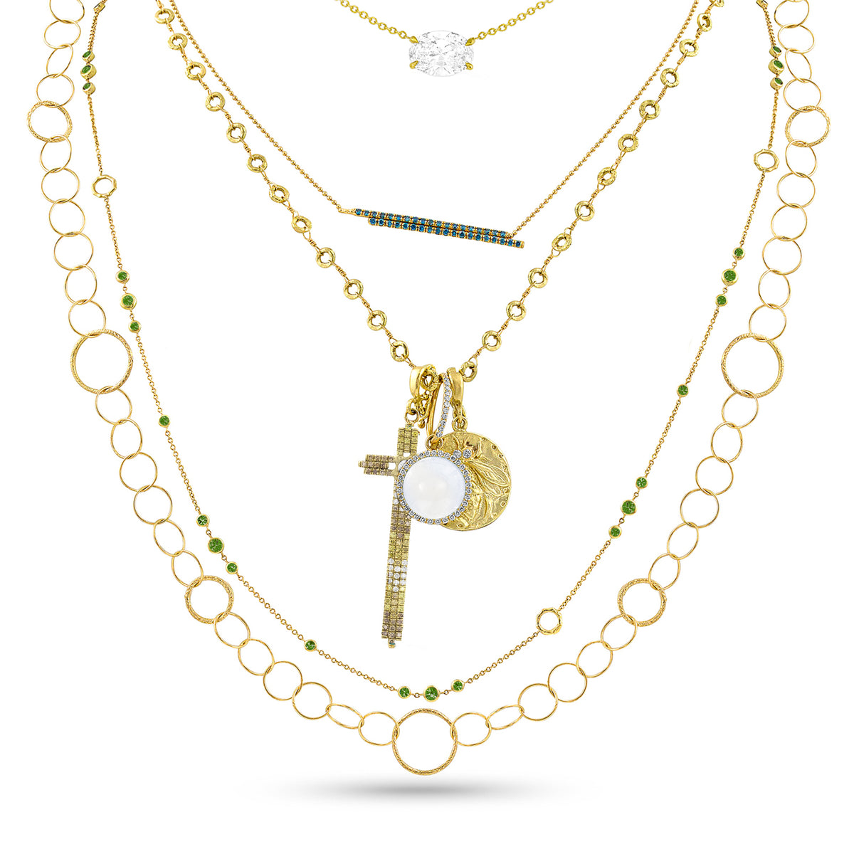 Graceful emerald-kissed delicate station necklace with iconic Dominique Cohen bamboo-texture feature links. A must-have style for every gal's jewelry wardrobe! Delightfully delicate color pop with ample length to wrap short or wear gracefully long. A lovely host for pendants and...