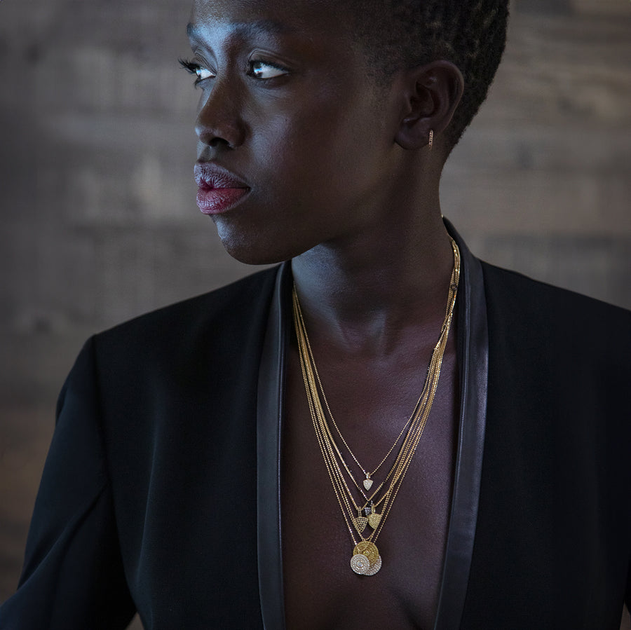 Dainty diamond pavé charmer. Classic subtlety worn solo, delicate scale and sparkle pop heading your necklace stacks. We make this cutie in two sizes and in an array of diamond and gemstone colors set in your choice of 18k rose,...