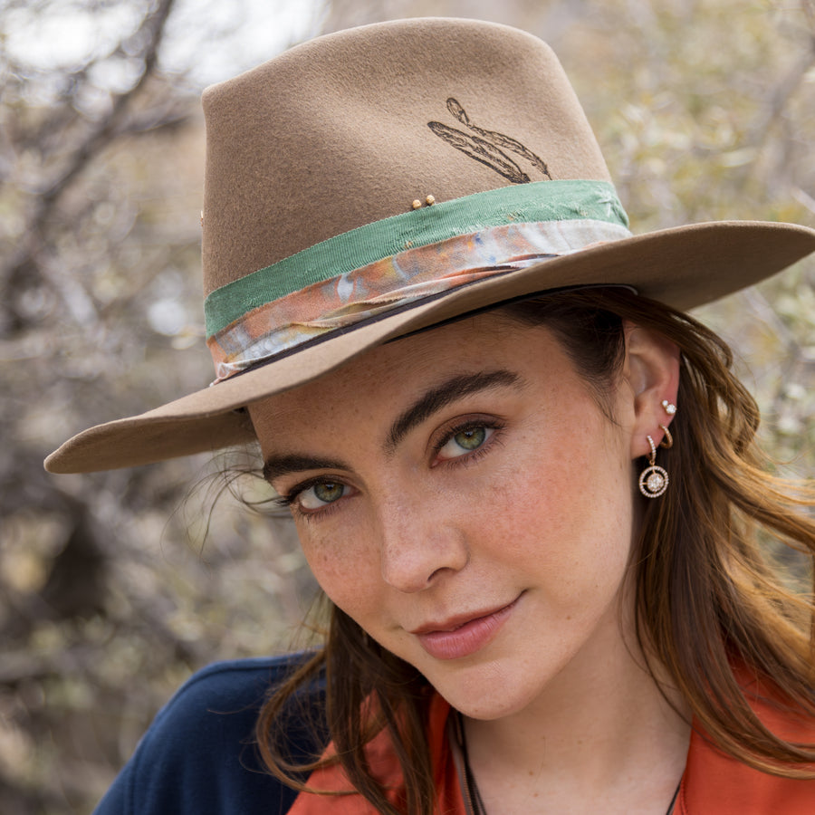 Classic master craftsmanship, classic fedora silhouette — taken next-level (and flatteringly so!). The fabulous slight upturn to this baby's front brim, for example: Hello, eyes! And her hand-tooled distress work, stitchwork, textiles, and burn motifs launch her (and her cousins)...