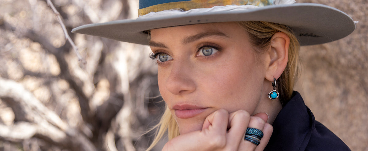 Color pop, sparkle pop, and contrast pop all in one earring! From the unmarred purity of the sleeping beauty turquoise cabochon, to the dimensional, undulating halo of baguette and round cut diamonds, each in a prong settings to invite maximum...