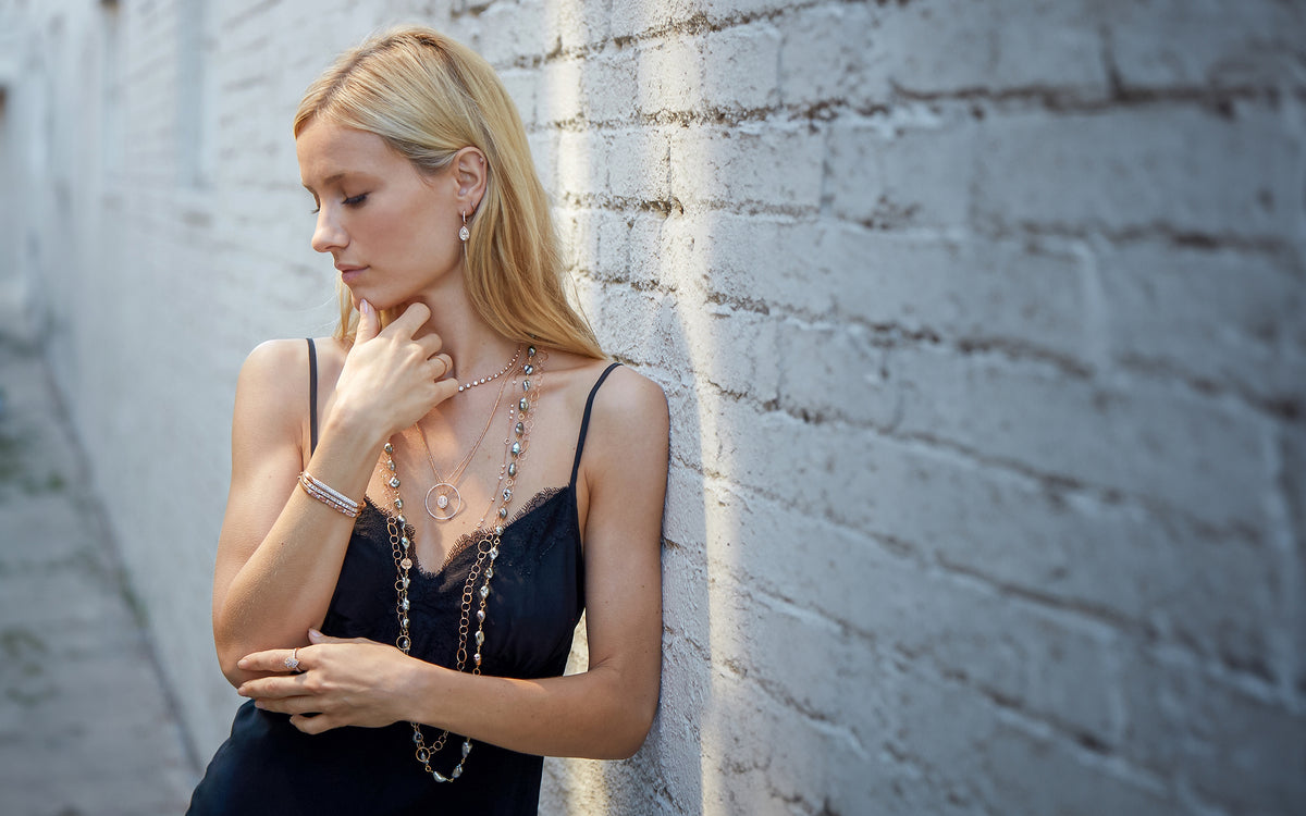 Graceful diamond-kissed delicate station necklace with iconic Dominique Cohen bamboo-texture feature links. A must-have style for every gal's jewelry wardrobe! Delightfully delicate solo — say, wrapped as one short loop, choker style, above one hung long — and invitingly elegant...