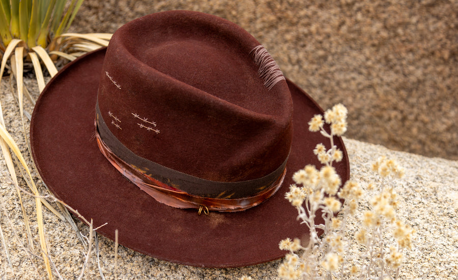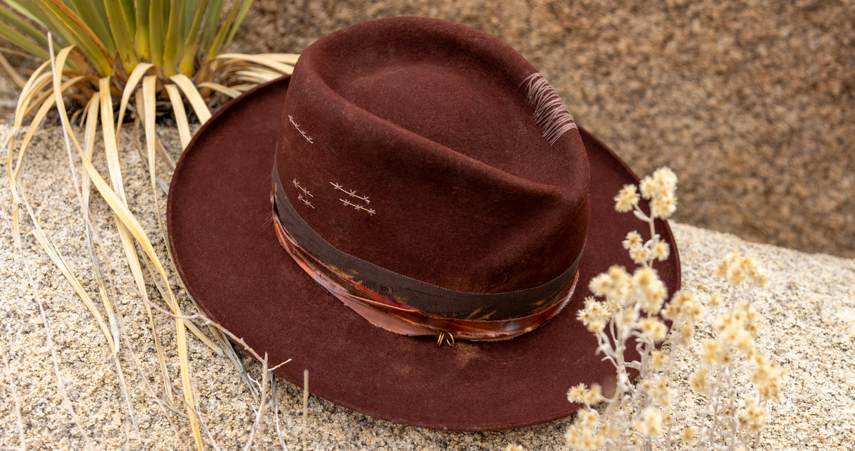 Classic master craftsmanship, classic fedora silhouette — stylishly taken next-level. The fabulous twist to this beauty's crown, for example. Love! And her pencil-roll brim, hand-tooled distress work, custom embroidery, hand-dyed textiles, and adorable burn motifs… We're talking a class of...