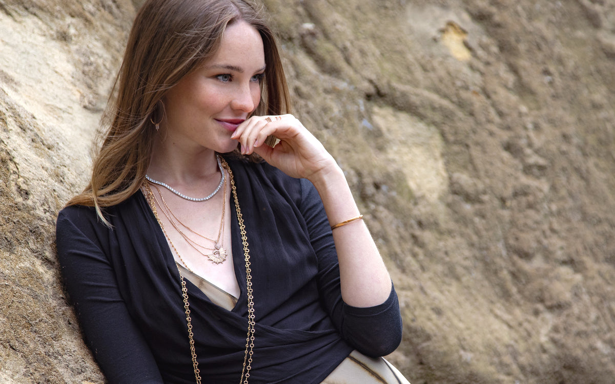 Look for our white diamond version of this beauty on Carrie Mathison (Claire Danes) in the series finale of Homeland on Showtime! Designer and client favorite: fabulous solo, fabulous as alluring, sparkly geometric interest in neck stacks. Four concentric, yellow...