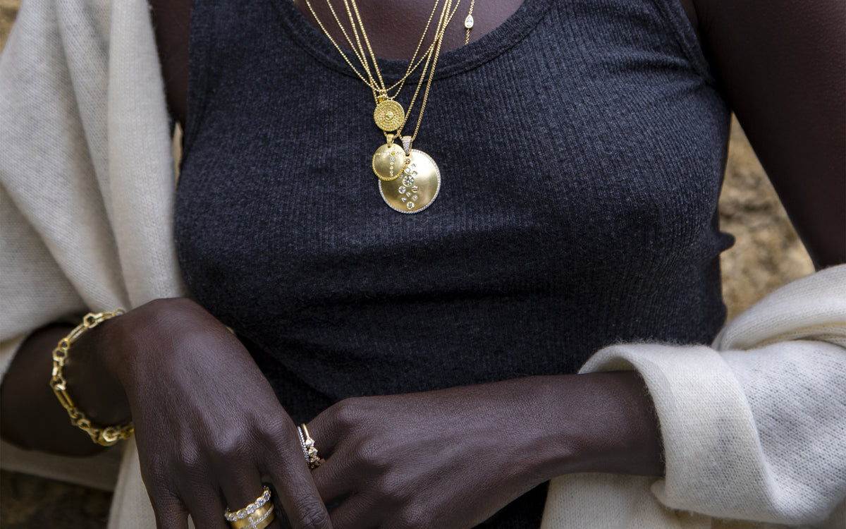 bespoke – one of a kind creations for a one of a kind you. Another in our stellar series of limited edition and one of a kind diamond-kissed shield pendant necklaces. We adorned this18 millimeter convex 18k gold shield in...