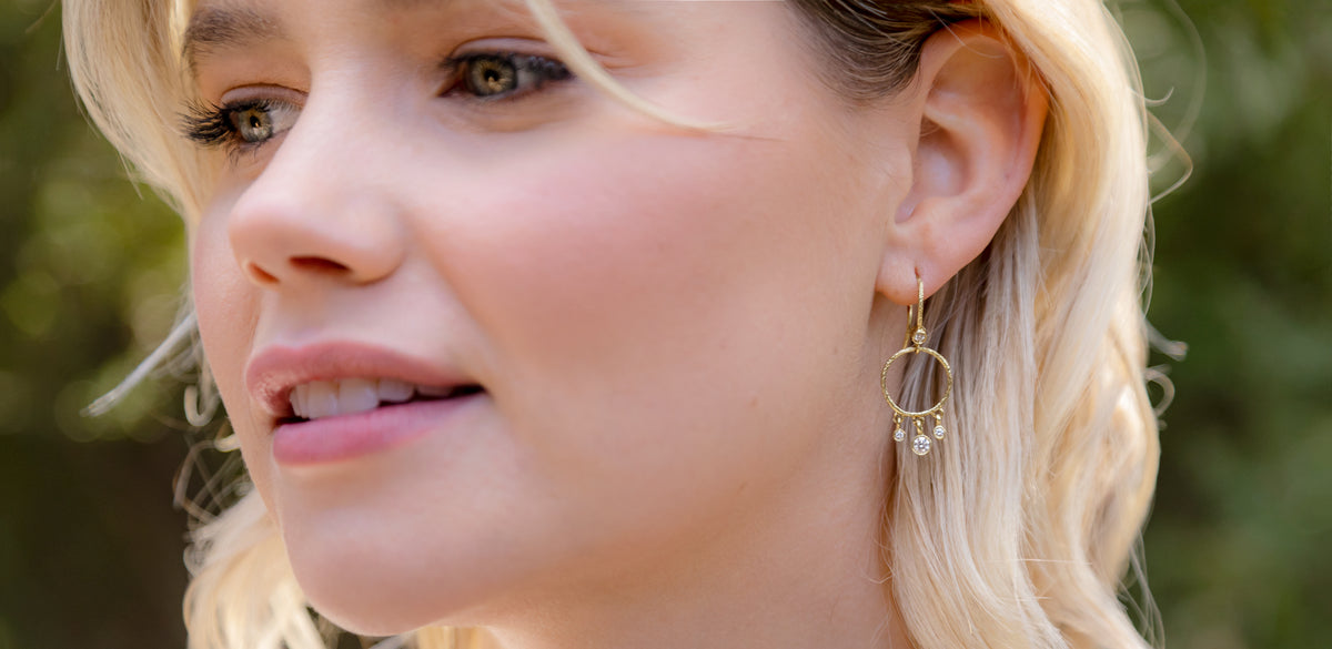 Our best selling, perfectly scaled, diamond fringe earring. Just the right sparkle and swing! Dress up, dress down — these babies dance along right with you. We make these textured danglers in white diamonds bezel-set into your choice of rose...