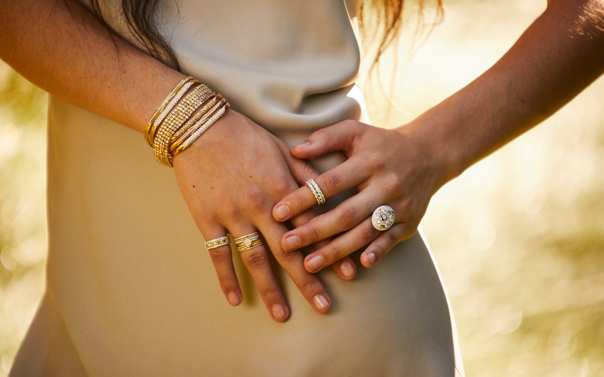 Our hand-crafted delicate stack rings throw oodles of sparkle and color pop. No wonder they're so popular! A must have — ideally in an array of colors — for every gal's jewelry wardrobe. We drill each setting by hand, pavé...