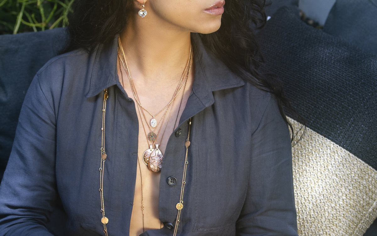 Designer and client favorite! This long, sleek box chain hosts a series of our dimensional, signature griffin coins. Airy and eye-catching — and perfect for layering with our diamond-kissed, gemstone, and carved link delicate chains. You'll love it! Part of...