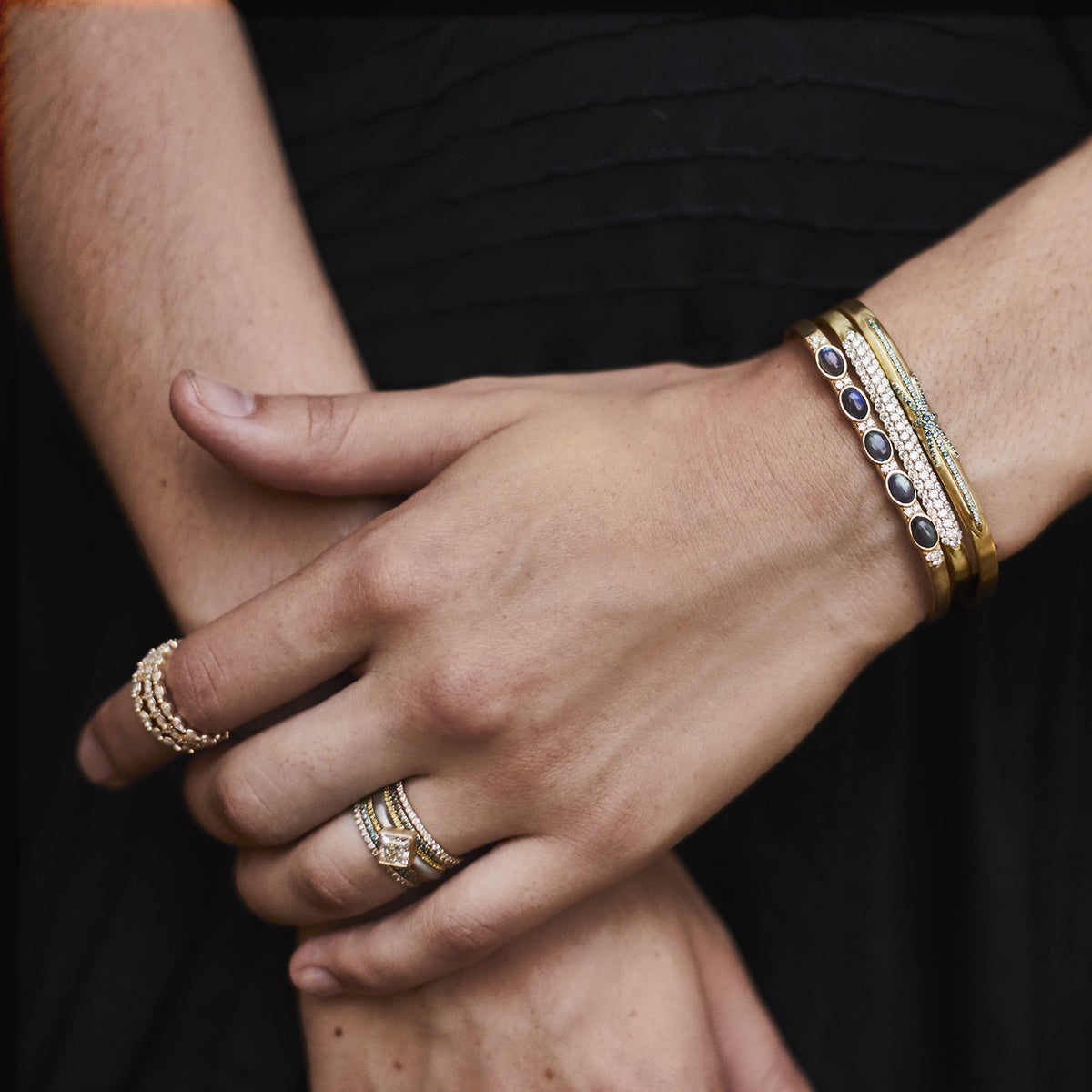 Snug to the wrist fit makes our DC-original hinged huggie bangles the height of bangle stack comfort. Design acumen, expert craftsmanship, and quality materials make them gorgeous. Stack 'em with others in our hinged huggie bangle series, or with our...
