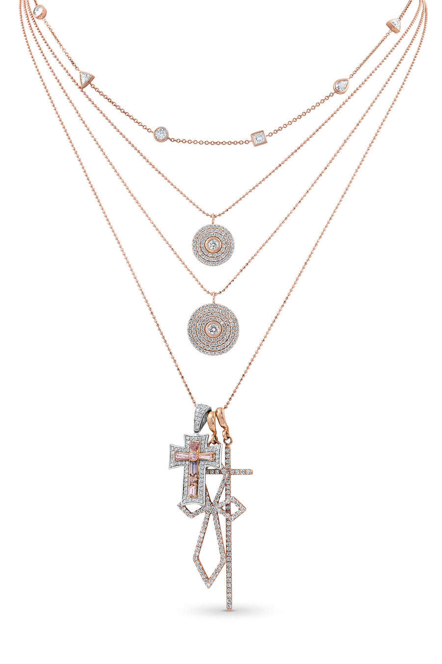 One of our favorite layering pendants. Art deco inspired, adds geometric interest — and sexy bling — to pendant stacks. Striking solo, as well! a perfect foundation pendant. Shown in 18k rose gold with 0.85 carats of shimmering white diamond...