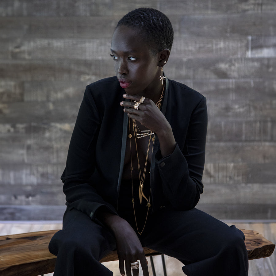 Gorgeous architectural diamond layering pendant of mixed geometric bezel settings. She's an instant classic — one of those pieces you will wear and wear. A stacking superstar who looks handsome flying solo, as well. We designed both north-south (vertical) and...