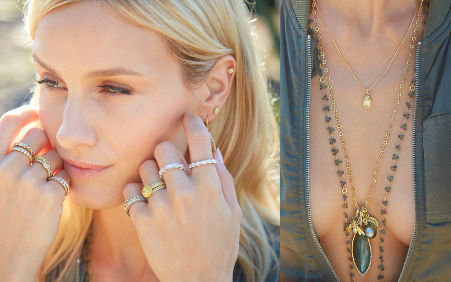 Our hand-crafted delicate stack rings throw oodles of sparkle and color pop. No wonder they're so popular! A must have — ideally in an array of colors — for every gal's jewelry wardrobe. We drill each setting by hand, pavé...