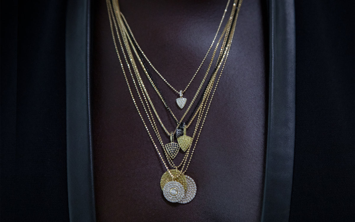 Our mosaic pendant necklaces are designer and client favorites: fabulous solo, fabulous as alluring geometric pop in neck stacks. Look for our four halo (large) white diamond, yellow gold version of this beauty on Carrie Mathison (Claire Danes) in the...