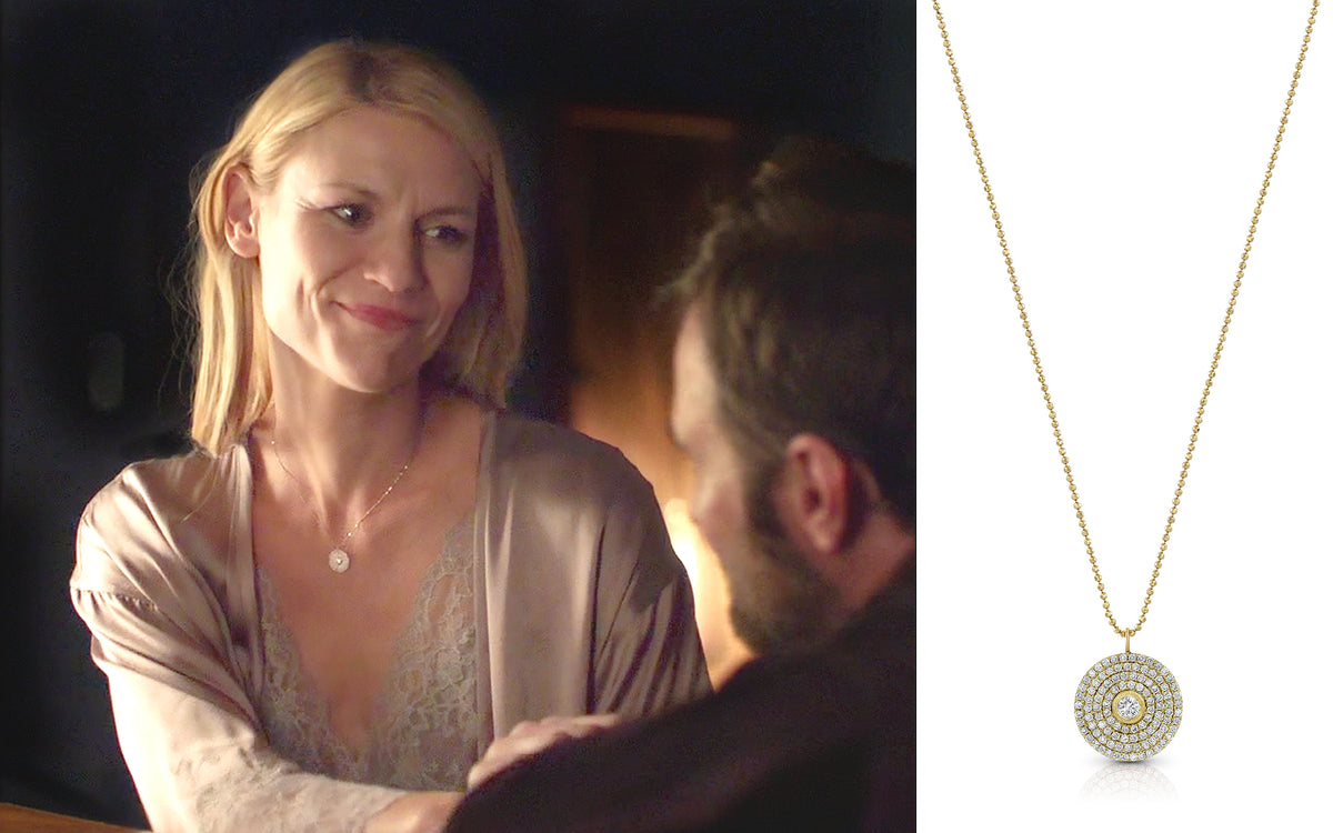 Carrie Mathison (Claire Danes) wore our 18k yellow gold, white diamond necklace,