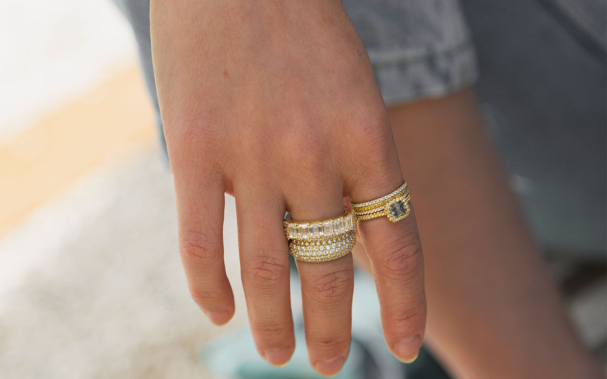 Our hand-crafted delicate stack rings throw oodles of sparkle and color pop. No wonder they're so popular! A must have — ideally in an array of colors — for every gal's jewelry wardrobe. We drill each setting by hand, pavé...